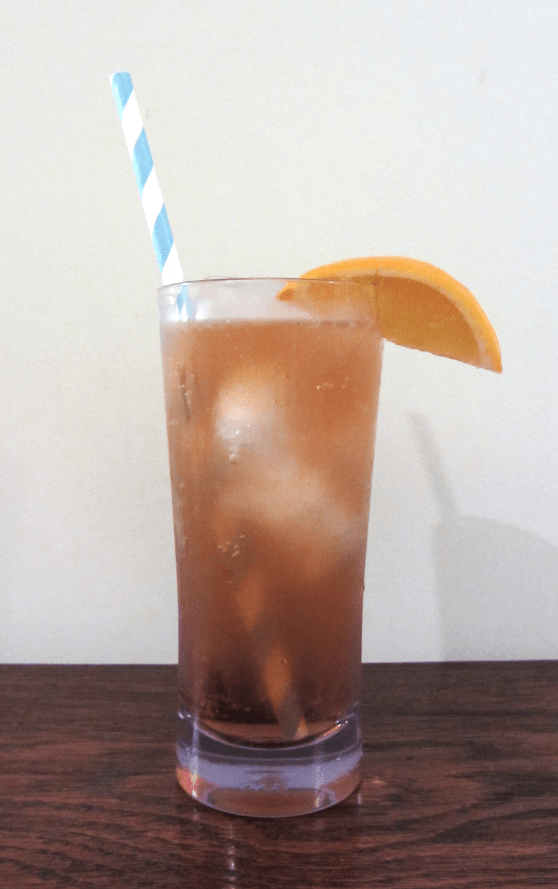 - Combine all (except orange wedge) in a highball glass filled with ice.